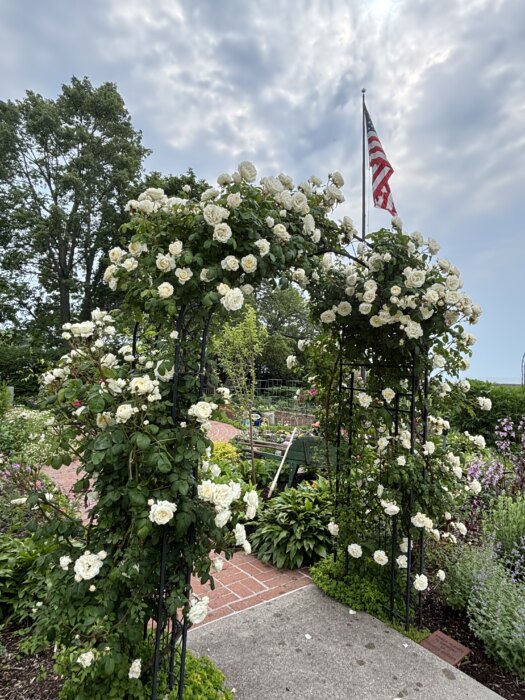 The arbor leading onto the lawn from the Trial Gardens was donated by the Veterans Garden Committee of the Garden Center. It is planted with white climbing roses and clematis.